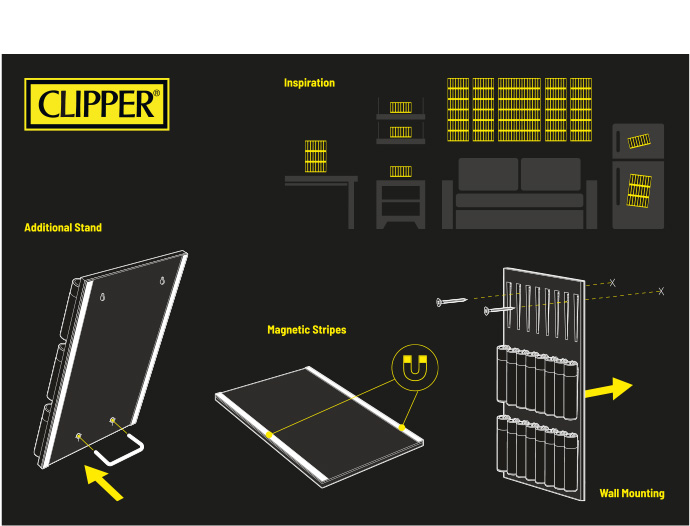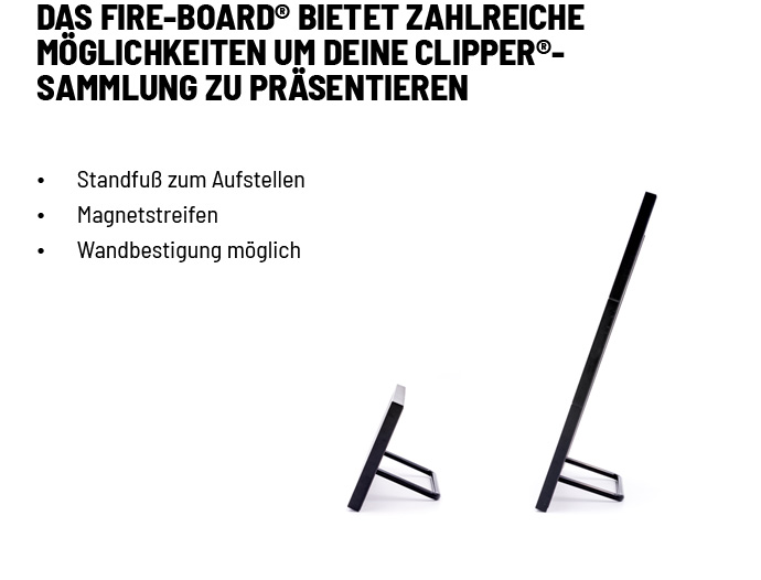 Mit dem FIRE-BOARD® wird Deine CLIPPER®-Sammlung an jedem Ort zum Blickfang! Ob als beeindruckende Feuerzeug-Präsentation an der Wand, als Ausstellungsstück auf Möbeln und Regalen oder am Kühlschrank, das FIRE-BOARD® ist vielseitig einsetzbar. Dank einer neuartigen Vorrichtung lassen sich CLIPPER®-Feuerzeuge einfach auf-/abstecken und beliebig anordnen.